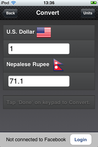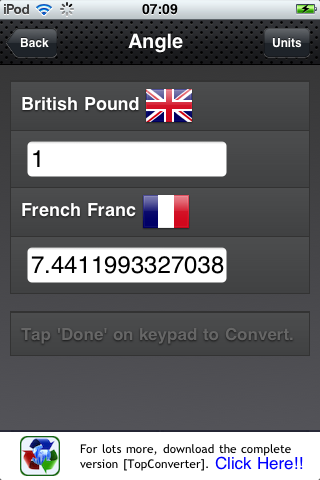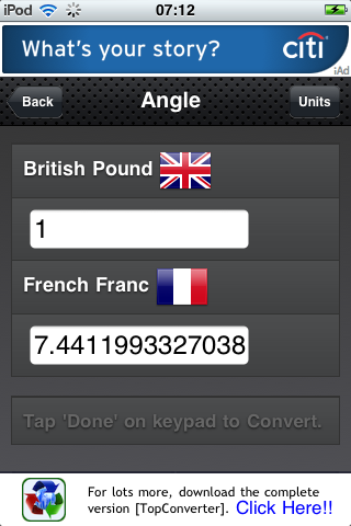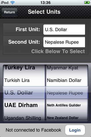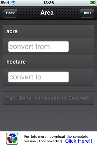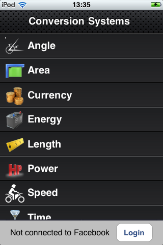 Convert Free mostly uses the simple row-detail information flow common to many applications on the iPhone. For most conversions;