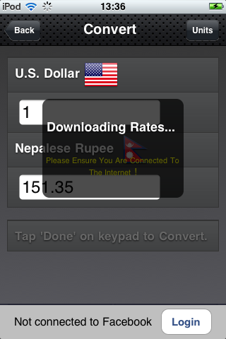 - Click on the calculator button in the 'Convert' view to call up the in-built calculator. The value in the top textField transfers to the calculator. After the user manipulates the calculator for the desired value, returning to the 'Convert' view automatically copies the new value into the top textField in the 'Convert' view.